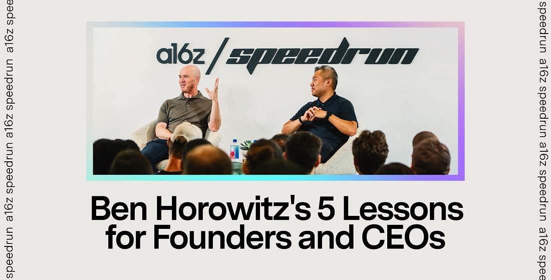 Ben Horowitz's 5 Lessons for Founders and CEOsTakeaways from a recent talk given by a16z cofounder Ben Horowitz at a gathering of speedrun founders💡 This Week’s Big Ideas🤖 Is AI a bubble? Find out this Thursday by attending our live Office Hours with Exponential View’s Azeem Azhar. Register on Partiful to attend. 🎤 Andrew Chen shares how he’s using voice dictation as part of his daily workflow. “Doing email is basically just a few hours a day of talking to my computer.” 📈 Troy Kirwin says it’s time to have a conversation about ARR 🍪 Andrew Lee wants to know if doing this to cookies makes him a bad person 💼 Join our talent network for more opportunities. If we see a fit for you, we'll intro you to relevant founders in the portfolio. In a recent talk delivered before an audience of a16z speedrun founders from the class of SR005, a16z cofounder Ben Horowitz warned there are no easy shortcuts to understanding the task that awaits them as they lead their companies. “Nobody’s gonna train you to be a CEO,” Horowitz said. “There are no five steps for being a CEO.” Instead, the problems founders are set to encounter are overwhelmingly likely to be situation-specific. So founders and new CEOs often need people they can trust and discuss their problems with, preferably experienced operators who “know what they’re talking about,” in Ben’s words. With that caveat in mind, Horowitz offered the founders some of his hardest-won lessons. Below are five that stood out. 1) Do the thing you can do, even when all the options look badWhen Ben took his company Loudcloud public in 2001, he saw it as the least bad choice out of many very bad options. The move was, he remembers, “clearly a bad idea.” But the only other option, after having spoken with “literally every investor in the private markets, was bankruptcy.” Horowitz says that at moments like these, he often sees founders and CEOs hesitating to make a hard choice. They know they need to do the hard thing: to fire that underperforming sales lead, or re-architect the product. Faced with a seemingly impossible decision, they make the mistake of biding for time, which only compounds the pain they’re facing. In Loudcloud’s case, Horowitz says, bankruptcy “was obviously a worse choice than going public.” So he made the painful decision, and took Loudcloud to the public markets. Horowitz says if he’d thought about “all the things that were gonna happen to me when I went public—and they all did happen to me, by the way—I would’ve just shot myself in the head.” But hesitating would have been even worse. Ultimately, Horowitz was able to hold the company together and sold it to HP for $1.65 billion in cash in 2007, a journey he’s written about in detail in his bestselling book The Hard Thing About Hard Things. When it’s all on the line, decisiveness is key to survival. As a founder or CEO, your job is to act under uncertainty.